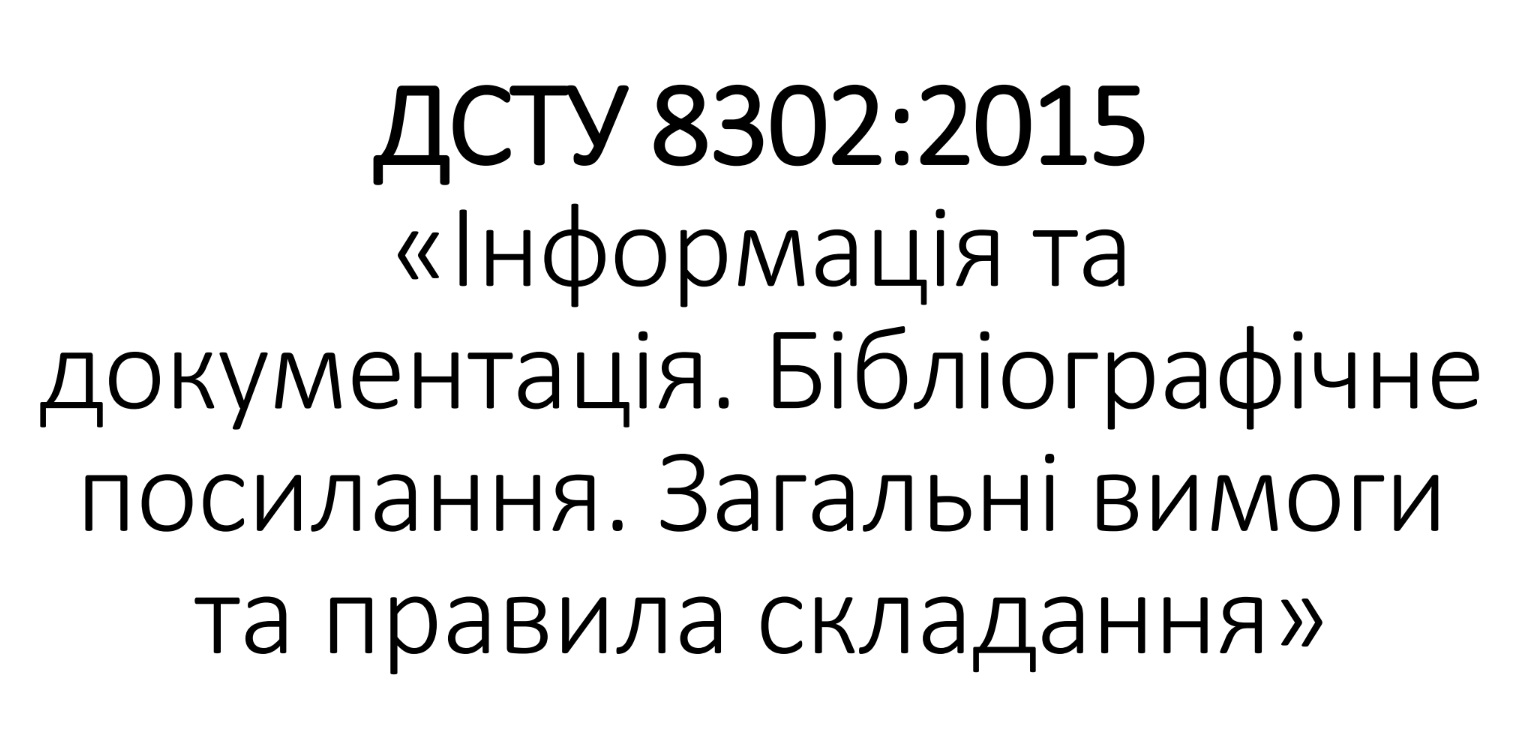 "Інформація та документація. Бібліографічне посилання. Загальні вимоги та правила складання" — стандарт установлює основні види бібліографічних посилань, загальні положення щодо їх складу й структури, а також правила складання та розміщення в документах (виданнях, депонованих документах тощо). Також доступний розширений варіант.